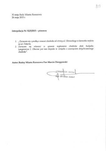 W trakcie majowej sesji zwróciłem się z prośbą o remont chodnika od strony ul. Słowackiego w kierunku wejścia na ul. Dekerta oraz wykonanie chodnika obok budynku przy ul. Langiewicza 1, w związku z usunięciem dotychczasowego przejścia. W odpowiedzi otrzymałem informację, że chodnik przy ul. Słowackiego jest w utrzymaniu Zarządu Zieleni Miejskiej i uznano, iż jest w „dobrym stanie technicznym”. Miejsce, które wymaga remontu jest w utrzymaniu właściciela prywatnej posesji. W związku z tym Straż Miejska w Rzeszowie podejmie działania mające na celu „wyegzekwowanie od właściciela naprawę chodnika”. Z kolei, teren, na którym znajdował się chodnik przy ul. Langiewicza stanowi własność Wspólnoty Mieszkaniowej, która podjęła decyzję o jego likwidacji.