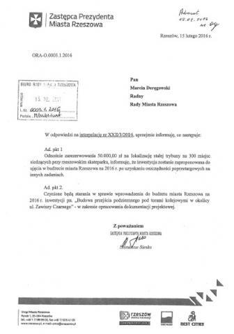 26 stycznia 2016 roku zwróciłem się z prośbą do Prezydenta o rozważenie wprowadzenia do budżetu środków w wysokości ok. 50 tys. zł, z przeznaczeniem na zamontowanie stałej trybuny na rzeszowskim skateparku na ok. 300 miejsc siedzących. Podczas sesji Miasta Rzeszowa prosiłem również o wprowadzenie do budżetu inwestycji pt. „Budowa przejścia podziemnego pod torami kolejowymi” w okolicach ulicy Zawiszy Czarnego. Uzyskałem zapewnienie, że budowa trybuny zostanie zaproponowana do ujęcia w budżecie miasta na 2016 r. po uzyskaniu oszczędności przetargowych na innych zadaniach. Będą również czynione starania w zakresie opracowania dokumentacji projektowej w sprawie budowy przejścia podziemnego.