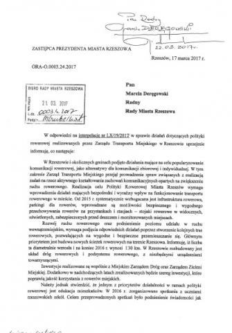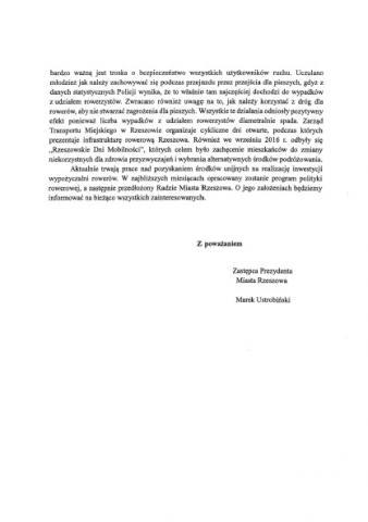 Panie Prezydencie, od ponad 18 miesięcy tzw. sprawy rowerowe są w gestii Zarządu Transportu Miejskiego. Proszę o informację jakie działania na rzecz upowszechniania polityki rowerowej przez ZTM są realizowane i od kiedy te instytucje odpowiadają za ten obszar? W odpowiedzi otrzymałem informację, że w Rzeszowie i okolicznych gminach podjęto działania mające na celu popularyzowanie komunikacji rowerowej, jako alternatywy dla komunikacji zbiorowej i indywidualnej. W tym zakresie Zarząd Transportu Miejskiego przejął prowadzenie spraw związanych z realizacją zadań na rzecz aktywnego kształtowania zachowań komunikacyjnych opartych na zwiększeniu ruchu rowerowego. Realizacja celu Polityki Rowerowej Miasta Rzeszów wymaga wprowadzenia działań mających bezpośredni i wyraźny wpływ na funkcjonowanie transportu rowerowego w mieście. Od 2015 r. systematycznie wzbogacana jest infrastruktura rowerowa, parkingi dla rowerów, wprowadzane są możliwości bezpiecznego i wygodnego przechowywania rowerów na przystankach i stacjach – stojaki rowerowe w widocznych, oświetlonych, zabezpieczonych przed deszczem i monitorowanych miejscach. Rozwój ruchu rowerowego oraz podniesienie poziomu udziału w ruchu wewnątrzmiejskim, wymaga podjęcia odpowiednich działań poprzez stworzenie kolejnych tras rowerowych, pozwalających na wygodne i bezpieczne przemieszczanie się. Głównym priorytetem jest budowa nowych ścieżek rowerowych na terenie Rzeszowa... liczba ta diametralnie wzrosła i na koniec 2016 r. wynosi 130 km. W Rzeszowie rozbudowywany jest układ dróg rowerowych i podsystemu rowerowego, z niezbędnymi urządzeniami towarzyszącymi. Inwestycje realizowane są wspólnie z Miejskim Zarządem Dróg oraz Zarządem Zieleni Miejskiej. Dodatkowo w nadchodzących latach zrealizowanych będzie szereg inwestycji, które poprawią jakość korzystania z rowerów miejskich. Należy jednak stwierdzić, że jednym z priorytetów działalności w ramach polityki rowerowej jest edukacja mieszkańców. W 2016 r. zorganizowano spotkania z uczniami rzeszowskich szkół. Celem przeprowadzonych spotkań było podniesienie świadomości jak bardzo ważna jest troska o bezpieczeństwo wszystkich użytkowników ruchu... Wszystkie te działania odniosły pozytywny efekt, ponieważ liczba wypadków z udziałem rowerzystów diametralnie spada. Zarząd Transportu Miejskiego w Rzeszowie organizuje cykliczne dni otwarte, podczas których prezentuje infrastrukturę rowerową Rzeszowa. Również we wrześniu 2016 r. odbyły się „Rzeszowskie Dni Mobilności”, których celem było zachęcenie mieszkańców do zmiany niekorzystnych dla zdrowia przyzwyczajeń i wybrania alternatywnych środków podróżowania. Aktualnie trwają prace nad pozyskaniem środków unijnych na realizację inwestycji wypożyczalni rowerów. W najbliższych miesiącach opracowany zostanie program polityki rowerowej, a następnie przedłożony Radzie Miasta Rzeszowa. O jego założeniach będą informowani na bieżąco wszyscy zainteresowani.